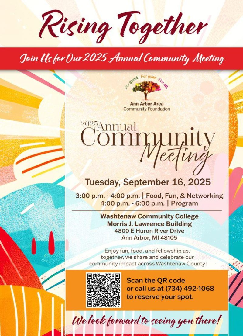 Be part of an inspiring afternoon where our community comes together to celebrate progress with food, fun and fellowship as “Rising Together,” we shape the future of Washtenaw County. This is your chance to connect with neighbors, leaders, and changemakers -but space is going fast.